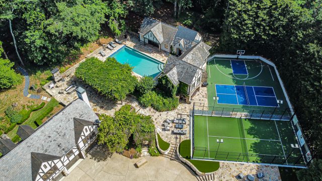 The 3.24-acre landscaped grounds of this 1930 Tudor in Tuxedo Park include pickleball, basketball, and padel courts, a putting green, a saltwater pool, and a dog run. The six-bedroom house has rich period and modern details, five fireplaces, spa-like suites, marble-clad chef’s kitchen, butler’s kitchen, paneled den, and two wine cellars.