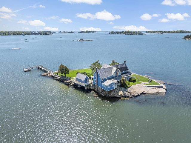 Belden Island is part of the Thimble archipelago in Branford’s Stony Creek harbor. The property includes a circa-1912, fully furnished four-bedroom house with original hardwood floors and wainscoting, stone fireplace and country kitchen with butler’s pantry.