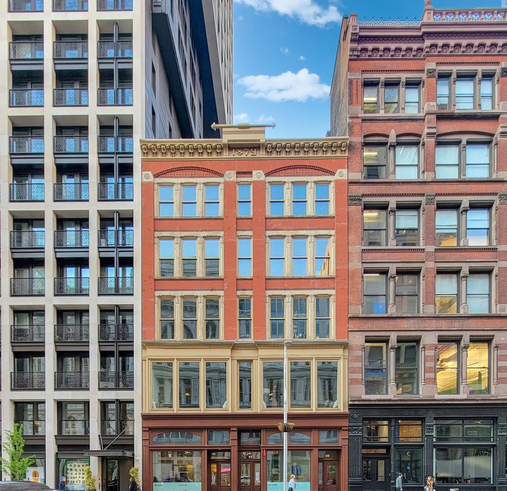 The restoration of this apartment’s 1879 building in Manhattan’s Flatiron District won a Landmarks Conservancy award. The full-floor, two-bedroom condo has 13.5-foot ceilings, wide-plank oak floors, cast-iron columns, painted and exposed-brick walls, 10-foot windows, French doors to a planted balcony, direct elevator access, huge living area, industrial chef’s kitchen, and flex space for extra bedrooms.