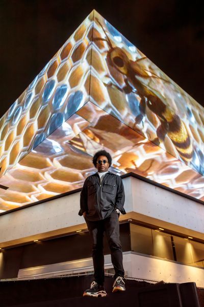 Description (from weho.org): Sunset Garden by artist Alexandre Arrechea examines architectural forms to uncover the choices, values, and tensions that shape our built environments, encouraging audiences to think differently about how these spaces influence everyday life. Through 3D-rendered bee and mask sculptures, the artwork explores the connection between space, community, and society. The work draws inspiration from the history of the Sunset Strip, the artist’s roots in Havana, and the gardens of Monsieur Balmain’s Villa and Olivier Rousteing’s immersive virtual reality designs. The artwork can be seen at the top of every hour on the digital billboard at 8497 Sunset Boulevard (The Now).