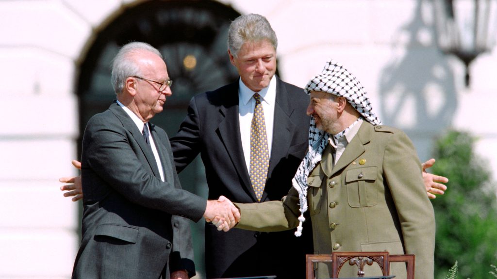 Secret negotiations in Norway between Israel and the Palestinian Liberation Organization — which had waged a terrorist campaign against Israel — produced the 1993 Oslo Accords. Signed on the White House lawn, with PLO leader Yasser Arafat, Israeli Prime Minister Yitzhak Rabin, and President Bill Clinton looking on, the agreement saw the PLO renounce terrorism and recognize Israel’s right to exist. It also created the Palestinian Authority to serve as a temporary five-year government in the West Bank and Gaza while negotiators addressed the roadblocks to Palestinian statehood. “We who have fought against you, the Palestinians,” said Rabin, “we say to you today in a loud and clear voice: ‘Enough of blood and tears!'” Polls showed a majority of Israelis and Palestinians supported the deal, but follow-up negotiations on the conflict’s most intractable issues went nowhere.