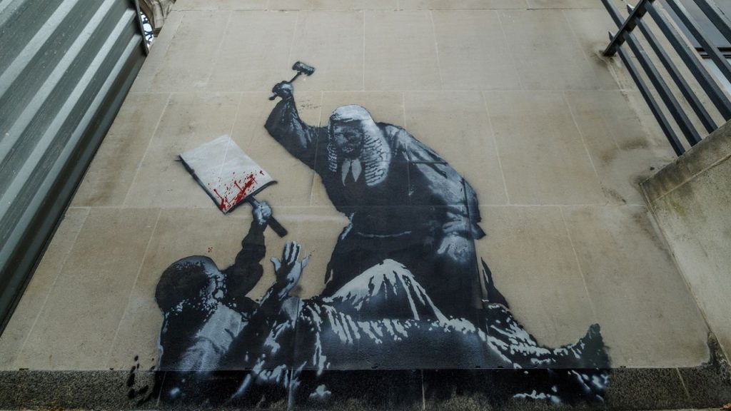 The stencil was presumed to be referring to the banning of the Palestine Action group, and the arrest of hundreds of its supporters. Security guards swiftly covered up the Banksy, and it was later removed. Officials said they’d had no choice as the building is listed. Legal experts pointed out that British judges don’t make the law, they just interpret it, and that they don’t use gavels.