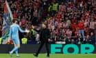 Continue reading…Club handed €45,000 fine and south stand shutdownFurther punishment over alleged racist abuse possibleThe Spanish Football Federation (RFEF) has handed Atlético Madrid a €45,000 (£37,000) fine and ordered a three-game partial closure of their Cívitas Metropolitano stadium after Sunday night’s city derby was suspended when supporters threw objects at the Real Madrid goalkeeper Thibaut Courtois. The club could also still face further punishment as the government’s anti-violence commission investigates allegations of racist abuse aimed at Vinícius Júnior.The referee, Mateo Busquets Ferrer, took the teams off the pitch in the 68th minute, per the formal protocol, after two appeals over the loud speakers did not stop the missiles, including lighters, bottles and plastic bags. The teams returned to the pitch 15 minutes later and the game was concluded with a late Atlético equaliser. Continue reading…