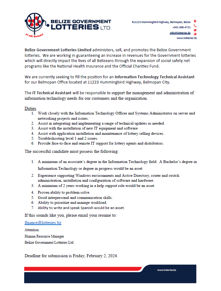In line with its growth and service enhancement strategy, Belize Government Lotteries Limited is actively looking to appoint an Information Technology Technical Assistant for its Belmopan office situated at 11223 on the Hummingbird Highway.