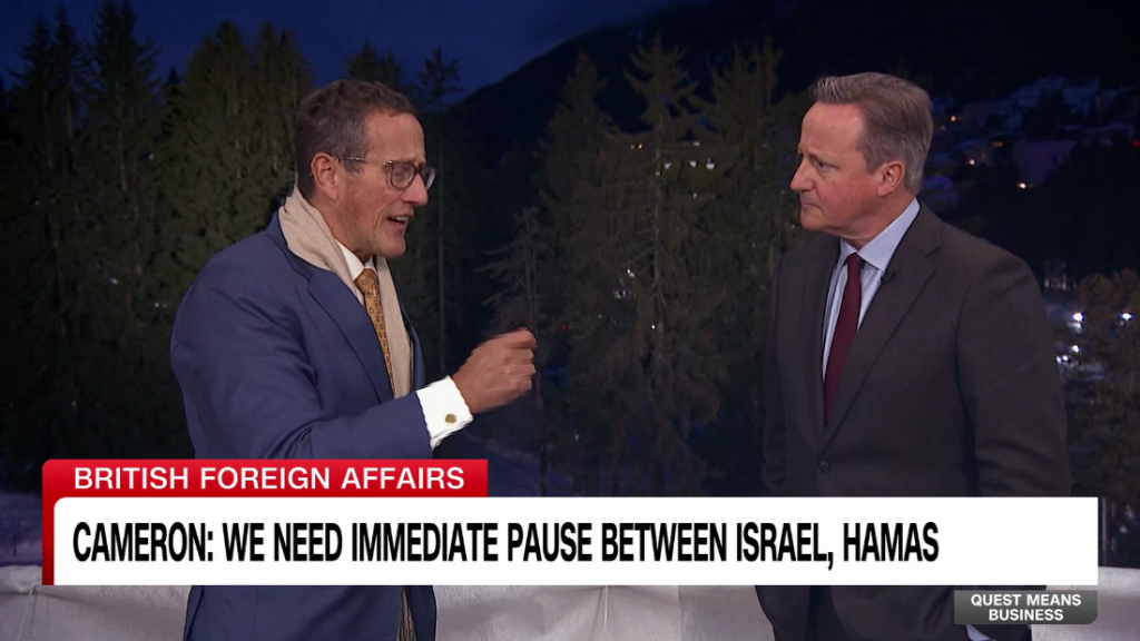 British Foreign Secretary David Cameron called for an “immediate pause” in hostilities between Israel and Hamas and weighed in on international aid to Ukraine. British Foreign Secretary David Cameron called for an “immediate pause” in hostilities between Israel and Hamas and weighed in on international aid to Ukraine.