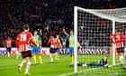 Continue reading…Dutch side win 3-2 from 2-0 down after 87 minutesMonaco 2-3 Benfica, Red Star Belgrade 5-1 StuttgartPSV staged a dramatic Champions League comeback against 10-man Shakhtar Donetsk in Eindhoven, winning 3-2 from two goals down in the 87th minute.The visitors went in front after just eight minutes from a quick breakaway, with Yukhym Konoplia setting up Danylo Sikan, whose shot squeezed beyond PSV keeper Walter Benítez. Oleksandr Zubkov doubled Shakhtar’s lead with a superb curling finish in the 37th minute, putting the Ukrainians in control of the match. Continue reading…