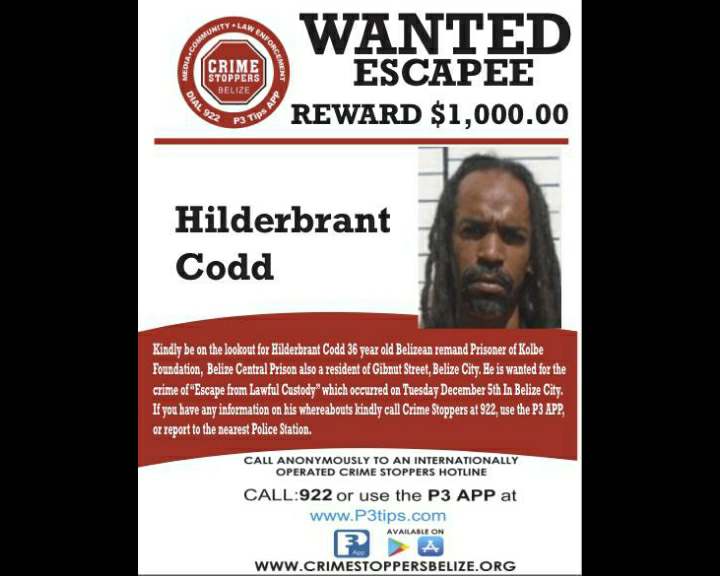 By Aaron Humes: This afternoon Crimestoppers Belize announced a one thousand dollar reward for information leading to the recapture of Hildebrand Codd.