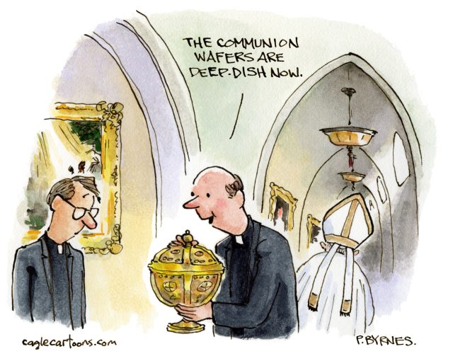 This editorial cartoon takes place in the Vatican. Two priests are in the foreground speaking while the new people is shown in the background from the back. The priest who holds a large, ornate chalice says to the other,