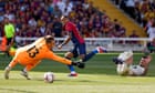 Continue reading…Raphinha hat-trick helps Barça extend their perfect startNapoli score twice in stoppage time to sink 10-man ParmaRaphinha scored the first hat-trick of his career and added two assists to guide Barcelona to a 7-0 rout of Real Valladolid in La Liga on Saturday.Hansi Flick’s side will go into the international break top of the table with a perfect 12 points from four games, seven clear of bitter rivals Real Madrid, who have a game in hand. Faving a side who gave Madrid a tough game last weekend, Barça were ruthless as they took their goal tally to 13 goals from four matches. Continue reading…