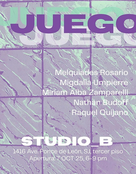 This Tuesday, October 7, 2025 (#martesdegalería) will be the opening of the collective exhibition “Juego,” at Studio B, from 6:00 to 9:00pm. The studio is located at 1416 Ponce de León Avenue (3rd floor), directly across from Escuela Central de Artes Visuales, in Santurce, Puerto Rico. As Nathan Budoff writes, “’Juego’ proposes art as a