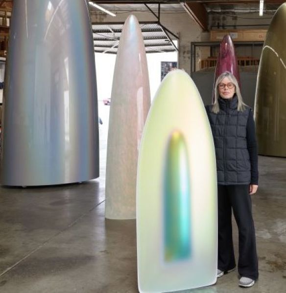 Over the course of her career, Colón’s work has been situated in dialogue with the legacies of Minimalism, Light and Space, and Land Art, extending the perceptual and geological concerns of these movements into a broader investigation of cosmic matter and planetary time. Her practice evolved from early investigations in painting—beginning with childhood landscape experiments in Puerto Rico in the 1970s and continuing through the earthen abstract paintings she produced from the 1990s through the 2010s. This sustained engagement with color and perception led her to explore the phenomenon of structural color, a natural process in which prismatic color emerges through the interaction of light and material structure rather than pigment. In 2012 Colón expanded this investigation into sculpture with the development of her Pods series (2012–present), biomorphic forms that suggest cellular or embryonic structures. Referencing natural phenomena such as the bioluminescent waters of Puerto Rico’s coastal bays, the iridescent surfaces of Caribbean nacreous shells, and the shimmering feathers of tropical hummingbirds, the works generate shifting fields of color that change with environmental light and the movement of the viewer.