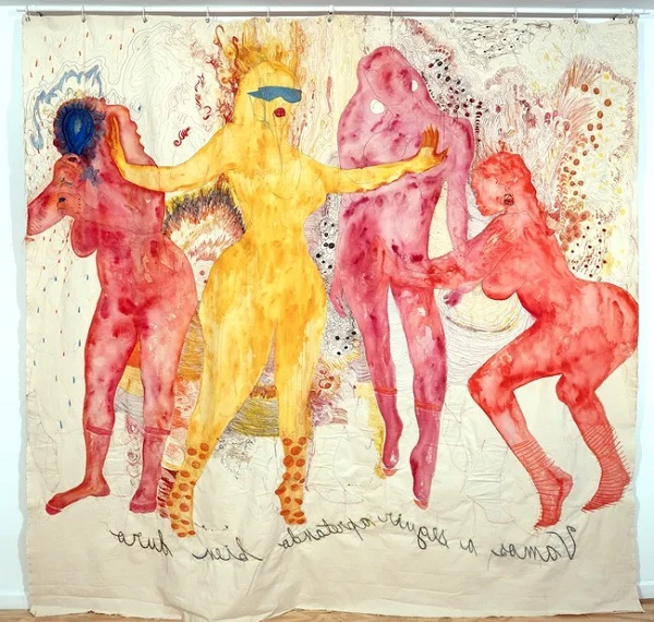 Adams constructs heavily encrusted surfaces by coating dried flowers in black paint, creating solemn, almost funerary compositions that operate as contemporary memorials. His works honor ancestral sacrifice while exploring themes of inheritance, resilience, and spiritual continuity. Meléndez builds layered, theatrical tableaux populated by women, jesters, matadors in high heels, and puppet-like figures. Through embroidery, paint, and textile interventions, she destabilizes archetypes and exposes the performative roles society assigns, particularly to women and cultural protagonists.