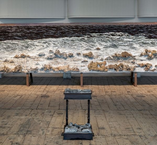 Formally, these works, with their diminished horizon, visually reference Monet’s iconic water lilies. But symbolically, no flowers appear here; where Monet painted delicate water lilies floating on water, Capote affixes heavy, sharp reef stones alongside sea imagery. This ironic artistic choice contrasts Monet’s idyllic scenes with Capote’s portrayal of the drama, hardship, and pain experienced by those confronting their reality and geography.