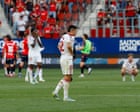Nine minutes had been added at Osasuna’s El Sadar Stadium, 19 seconds of which were left and, having led 1-0 until the 80th minute, Sevilla were now clinging to a draw. A point wasn’t much but was something when Osasuna took it. García’s exhausted players didn’t react and over by the bench the manager spun on his heel and threw his hands in the air, anger and anxiety rising inside. By the time García turned back, Osasuna’s Moi Gómez had crossed, unimpeded, and on 98.46 Alejandro Catena headed the winner. Osasuna’s coach, Alessio Lisci, went leaping up the line, with safety secured and Europe a genuine possibility; Sevilla’s crossed it, García marching on to the pitch, every step a stomp, ready to grab someone, anyone.