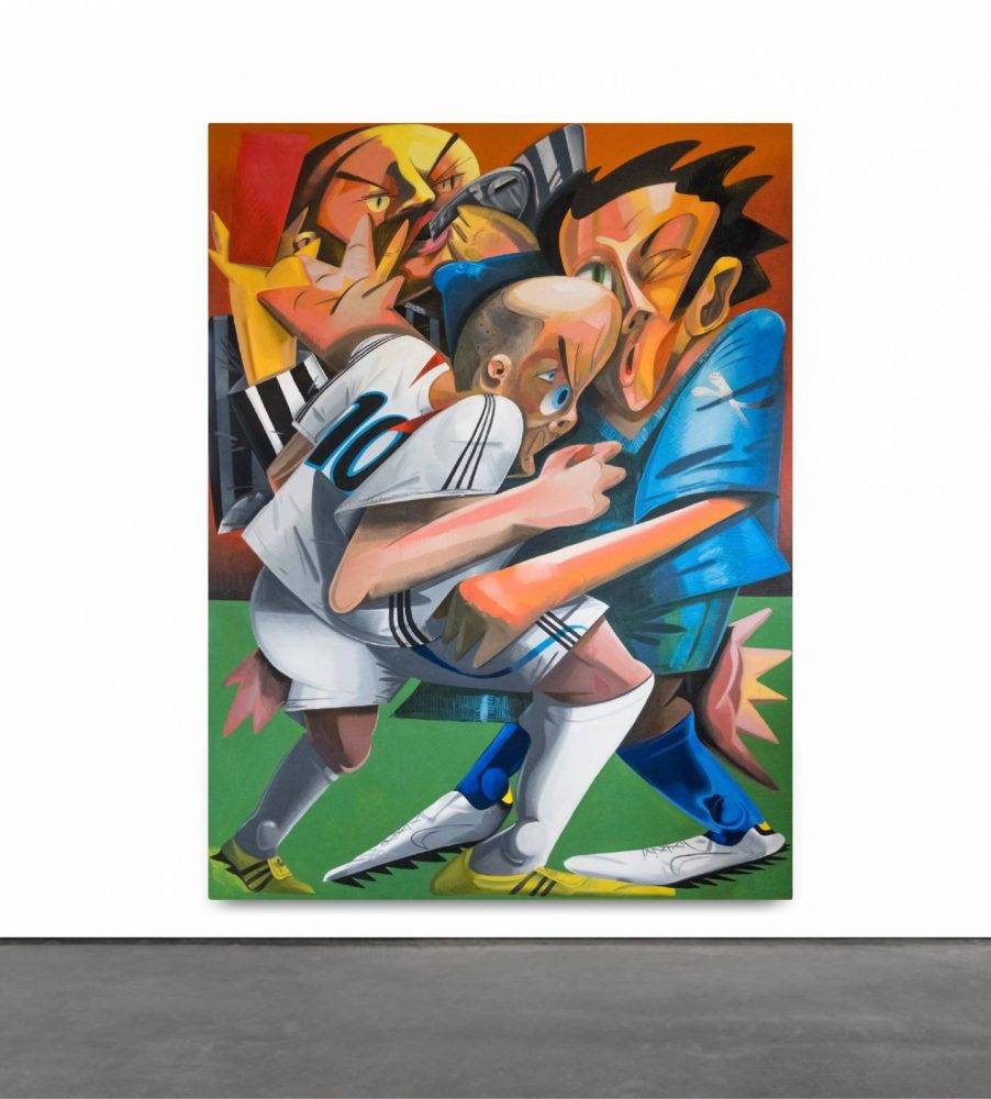 Each work depicts, in Grecia’s bold, graffiti-derived graphic style, a famous on-field conflict between players — hence the slang of the title.