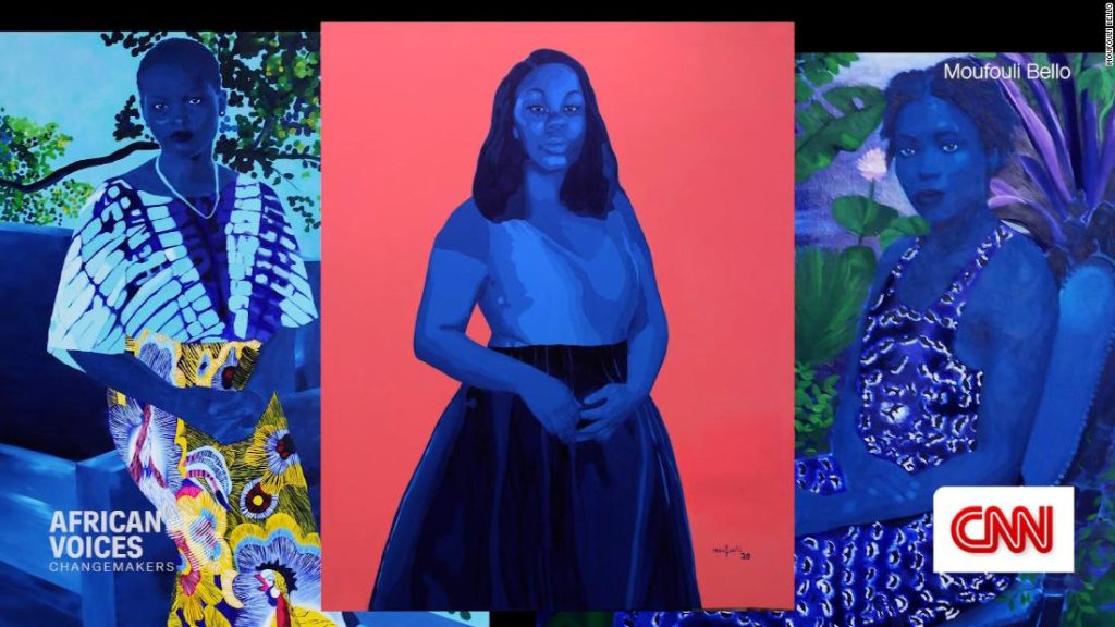 Benin’s Moufouli Bello is best known for her large-scale portraits of women with bright blue backgrounds and luminous colors. Her work has been exhibited around the world, including special commissions for American filmmaker Ava DuVernay.Benin’s Moufouli Bello is best known for her large-scale portraits of women with bright blue backgrounds and luminous colors. Her work has been exhibited around the world, including special commissions for American filmmaker Ava DuVernay.