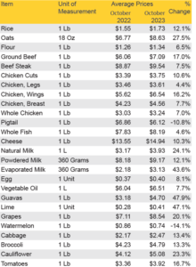 Generally, prices for food and non-alcoholic beverages are 11.5 percent higher than at this time in 2022, with food by itself rising by 12.4 percent. There were uniform increases for carbohydrates (rice, flour, bread, and tortillas, by 10.6 percent); fresh vegetables, including cilantro, carrots, habaneros, and cauliflower (17 percent); meat products, such as beef, pork, and poultry (8.2 percent); dairy products, including milk, cheeses, and eggs (15.1 percent); other food products, including sauces and condiments (13.6 percent); fresh fruits including plantains, guavas, limes, and grapes (17.6 percent); and cooking oils (14.6 percent).