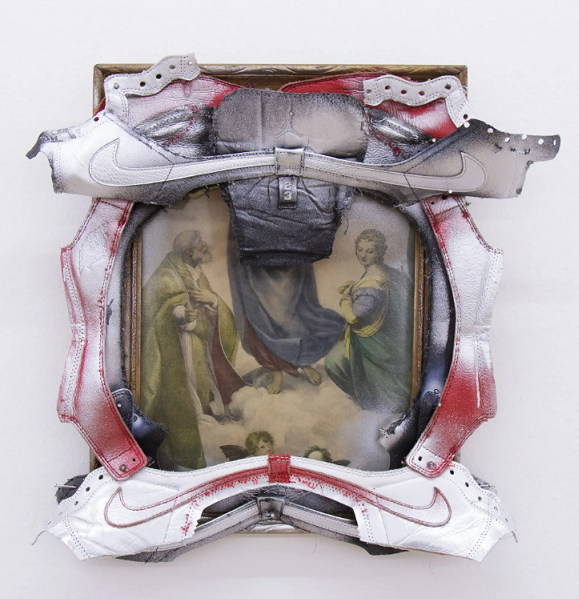 [Shown above: mujero, “Reprieve,” 2024, Air Jordans, wooden frame, and nails, 15 ¾ x 16 x 2 ¾ in. (artwork © mujero; photograph courtesy Microscope Gallery)]