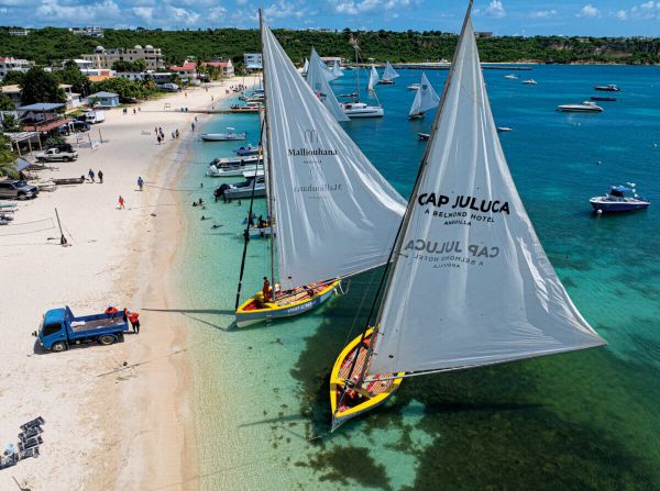 Boat racing is the national sporting passion and pastime in Anguilla. In this case, boats are hand-built vessels crafted by family and friends in island backyards and neighborhoods, with 28-foot-long hulls, 54-foot-tall masts, and a 42-foot boom. These are Class A boats, with up to 20 to 22 crew. There’s also a Class B that’s 23-foot long.