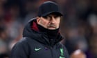 Continue reading…Manager says ‘top centre-halves’ will be unavailable to buy Matip expected to miss rest of season with knee ligament injuryJürgen Klopp has said Liverpool are unlikely to replace Joël Matip with a January transfer because “top, top, top centre-halves” will be unavailable and it would stifle the development of his defenders.The Liverpool manager believes his squad can withstand the loss of Matip, who sustained a cruciate ligament injury against Fulham on Sunday, providing Virgil van Dijk, Ibrahima Konaté, Joe Gomez and Jarell Quansah remain fit. The 20-year-old Quansah is enjoying a breakthrough season and Klopp is reluctant to block the pathway of any gifted young player. Continue reading…