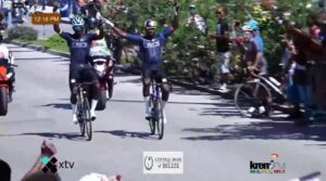 Justin Williams of L39ION of Los Angeles (right) won the 2026 Krem’s New Year’s Day Cycling Classic along with teammate Jyven Gonzalez. Photo: XTV Belize screenshot