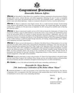 Barrow issued thanks to Democratic Minority Leader of the U.S. House of Representatives, New York congressman Hakeem Jeffries. Jeffries’ written citation says Barrow “exemplified a lifelong commitment to the advancement of Belize through public service, cultural advocacy and global engagement,” with particular emphasis on sustainable development, social equity and national pride. The album “Shyne” was released in 2000 and was certified platinum, while also earning several Grammy Awards.