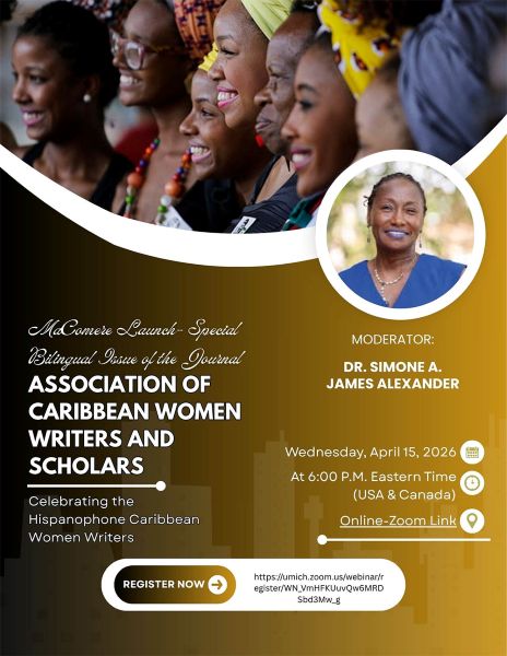 The Association of Caribbean Women Writers and Scholars (ACWWS) invites you to the launch of its first bilingual (English and Spanish) issue of the journal MaComère. The launch is organized around the theme Celebrating the Hispanophone Caribbean Women Writers. The launch will take place online (Zoom) on Wednesday, April 15, 2026, at 6:00pm (EST) and the