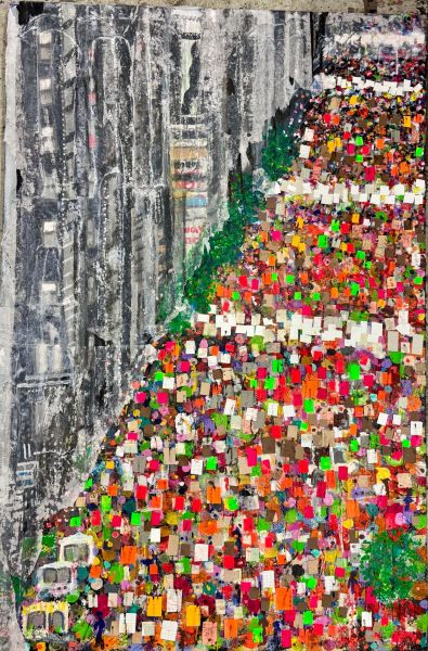 Fountain House Studio and Gallery in Manhattan works with people with mental illnesses, supporting artists like Alyson Vega, who had to leave her job as a math teacher after sustaining a brain injury. Through Fountain House’s booth, the native New Yorker of Puerto Rican descent displayed her remarkably sophisticated compositions of the city’s streets during Trump protests, using fabric, acrylic, and paper. [. . .]