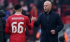 Continue reading…Forest have spent more than £360m since 2022Slot adds: ‘It’s still an unbelievable accomplishment’Arne Slot has said Nottingham Forest’s impressive rise should not come as a complete surprise given they have spent more money on transfers than Liverpool since winning promotion to the Premier League.The Liverpool head coach admits it is an “unbelievable accomplishment” for Nuno Espírito Santo and his team to sit third. Forest could reduce the gap on the Premier League leaders to three points with victory at the City Ground on Tuesday, albeit having played a game more. Continue reading…