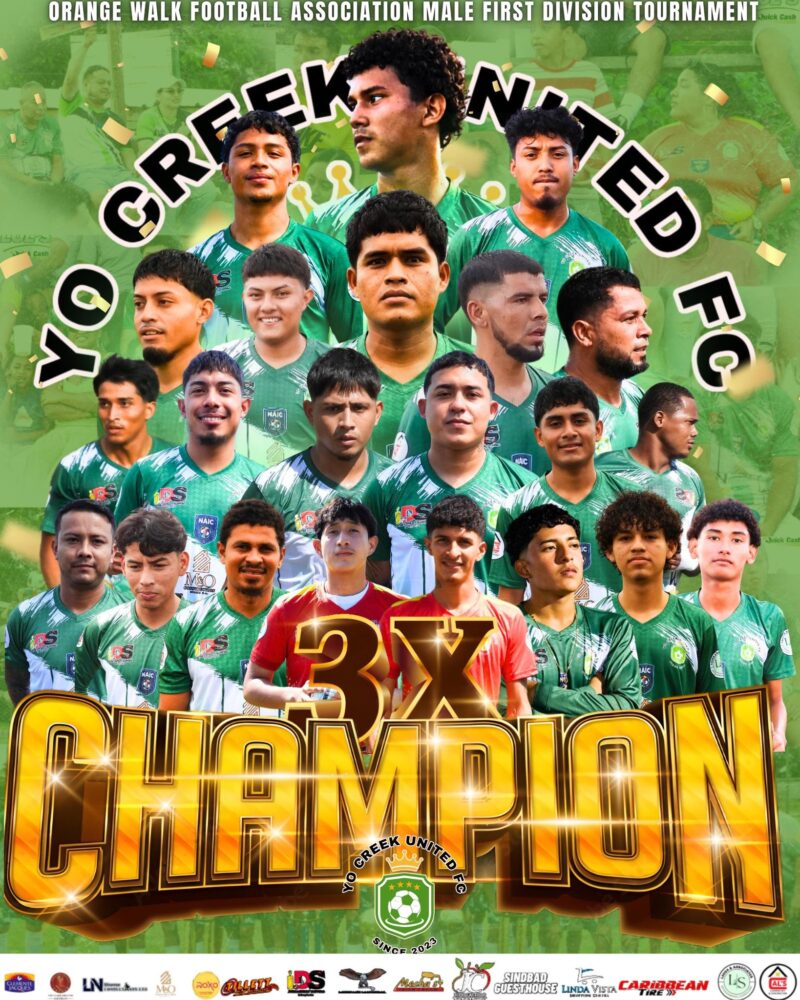 OWFA three-time consecutive champions Yo Creek United – Photo Credit: Yo Creek United FC By Rubén Morales Iglesias: Yo Creek United FC clinched their third consecutive Orange Walk Football Association (OWFA) 1st Division title, winning the Opening Season 2025–26 Championship after a tense, hard‑fought final that went all the way to penalty shootouts on Sunday.