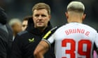 Newcastle were excellent for an hour against Milan on Wednesday but ended up losing 2-1 and dropping out of Europe at the end of a night when continued Champions League involvement had seemed well within their grasp. The problem was that, not for the first time in recent weeks, a side missing a starting XI of injured senior players simply could not sustain Eddie Howe’s hallmark, exhaustingly high-tempo, heavy-metal high-pressing game. Is a change, or at least a modification, of style required? No one can question the team’s often awe-inspiring commitment but human beings, even Joelinton, cannot run through brick walls. An energy-conserving Plan B, perhaps involving a cagier counterattacking plan, seems called for. After all, the very best sides all know how to slow games down and take control of midfield at the right moments. Otherwise burnout, mental as well as physical, surely beckons. Bad luck along with the pressures of juggling the Premier League with a European campaign have clearly played a big part in Howe’s casualty list but has the manager’s “intensity is our identity” motto been taken to extremes? Is it time for the medical and sports science departments to review training methods and rehabilitation protocols?