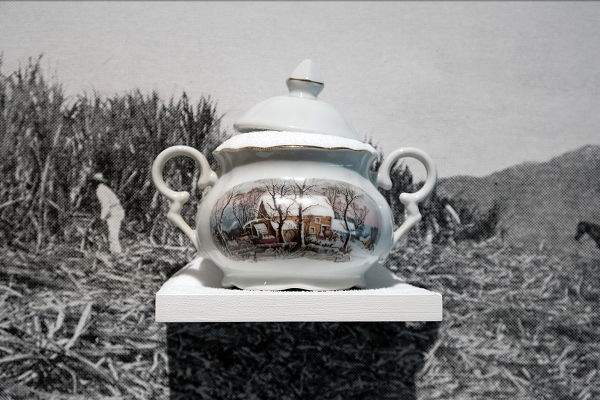 In the Focus section of Expo Chicago, curated by Katie A. Pfohl, San Juan gallery Embajada has works by Pablo Delano, a seventy-two-year-old artist born and raised in San Juan, Puerto Rico. His work centers around documenting the history and conflicts of Caribbean and Latino communities. In this display, Delano pairs photography with found objects. Delano’s photographs are laden with intensity, but there’s a carefully disruptive layer of levity imparted with a found object. In “The Sugar Bowl of The World,” Delano has taken a black-and-white photograph of Puerto Rican cane cutters and titled underneath it, “Porto Rican Cane Cutters Helping to fill the sugar bowl of the world,” and then he has obstructed the photo with a ready-made sugar bowl in front on a small white platform and added real sugar in the bowl. The historical oppression and exploitation of the people of Puerto Rico is indisputable, and Delano captures it with acuteness and irony.