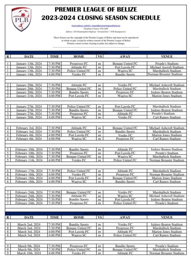 The Regular Season should be completed by Sunday, April 28, 2024 and the champions should be decided by May 26 to meet the deadline to submit to Concacaf the name of Belize’s representative to the Concacaf Champions Cup.