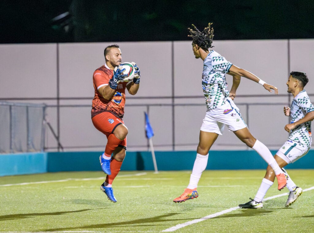 Verdes’ Desmond Wade against San Pedro’s goalkeeper Selvin Sagastume during 2-2 draw at Ambergris Stadium on March 1, 2025 – Photo Credit: San Pedro Pirates/Tom Cawthon