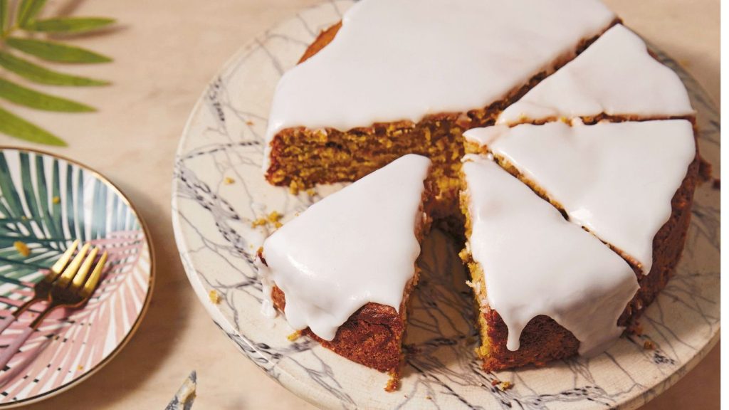- For the icing, mix the icing sugar and lemon juice to make a slick of glossy white. Pile into the middle of the cake and encourage it to ooze languidly towards the edges. This cake keeps well in a tin for a few days and the flavour only gets better, but the icing looks at its sleekest when fresh.
