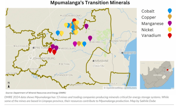 According to the 2024 database of the department of mineral resources and energy, Mpumalanga has 13 mines and companies trading in transition minerals. Oxpeckers research indicates some are indirectly involved in renewable energy storage solutions while others are under care and maintenance.