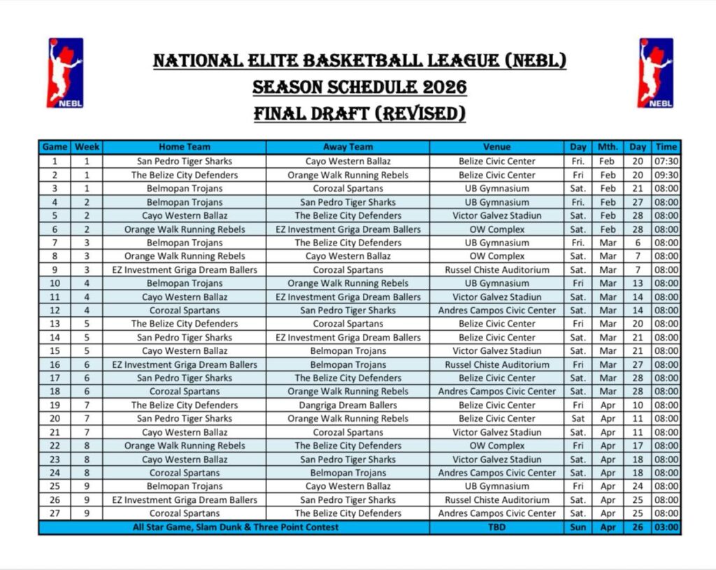 By Rubén Morales Iglesias: The National Elite Basketball League (NEBL) begins the 2026 season on Friday, February 21, with a double‑header at the Belize City Civic Center. The league returns under its restored branding after several years of post‑pandemic transitions.