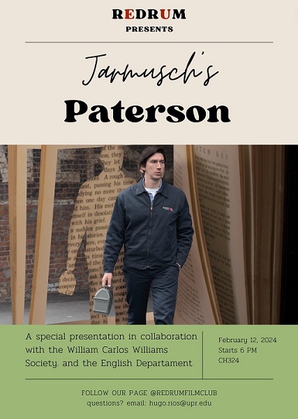 In the framework of the upcoming 10th Biennial Conference of the William Carlos Williams Society: “Crossing Borders / Cruzando Fronteras,” taking place at the University of Puerto Rico-Mayagüez, from February 15 to 18, 2024, the Red Rum Film Club and the English Department present a special screening Jim Jarmusch’s Paterson (2016).   The screening will take