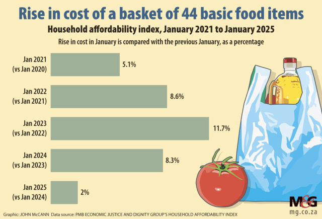 This is according to the Pietermaritzburg Economic Justice and Dignity Group’s Household Affordability Index for January 2025, which shows the average cost of a monthly basket of 44 basic items increased by R108.84 (2%) from R5 324.86 in January 2024 to R5 433.70 this month.