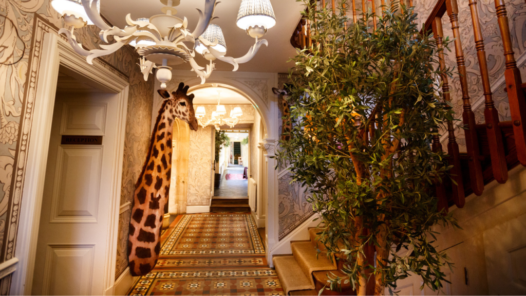 Giraffes, monkeys and bold, bright colours add a playful touch to this 800-year-old inn