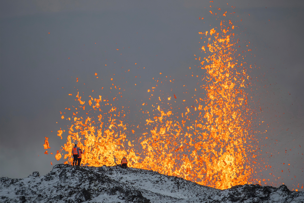 Scientists take measurements and samples in front of an active volcano in Grindavik, Iceland (Image credit: Marco Di Marco / AP)
