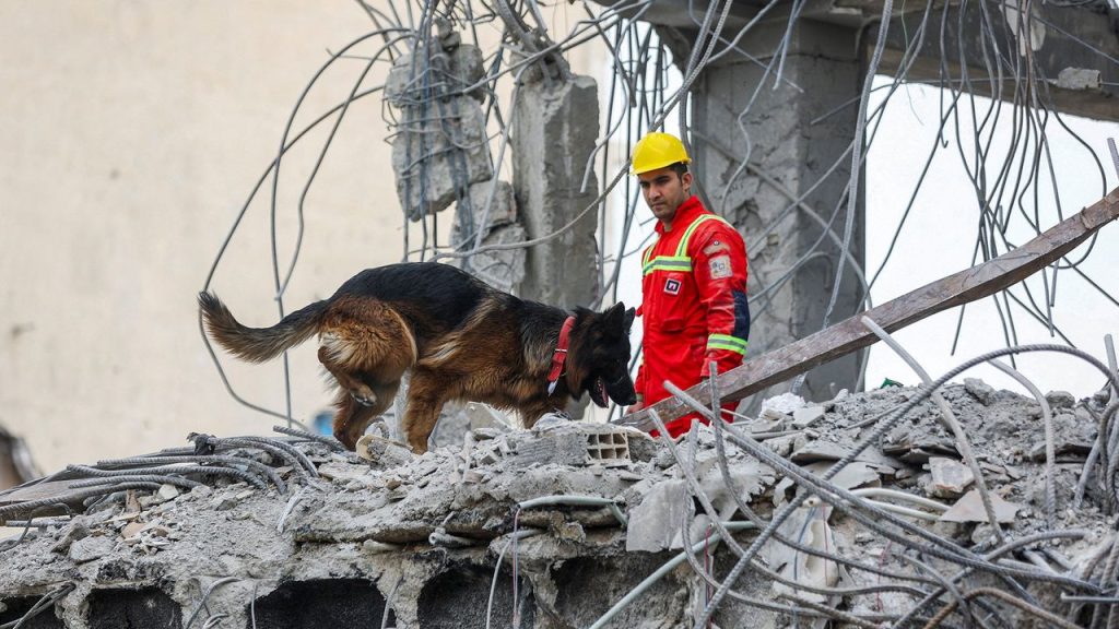 Emergency personnel and a dog search the site of a US-Israeli strike on a building in Tehran, Iran