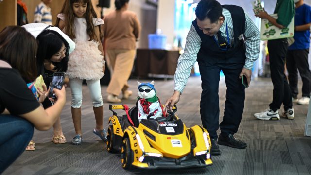 A Japanese shorthair cat named Mitang takes a ride in a remote-controlled toy car in Bangkok, Thailand (Image credit: Manan Vatsyayana / Getty Images)