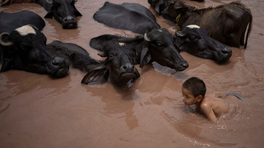 A child swims with a herd of water buffalo in Gujranwala, Pakistan (Image credit: Adrees Latif / Reuters)