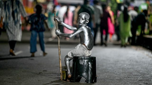 A silver-painted boy portraying Mahatma Gandhi seeks donations in Hyderabad, India (Image credit: Noah Seelam / Getty Images)