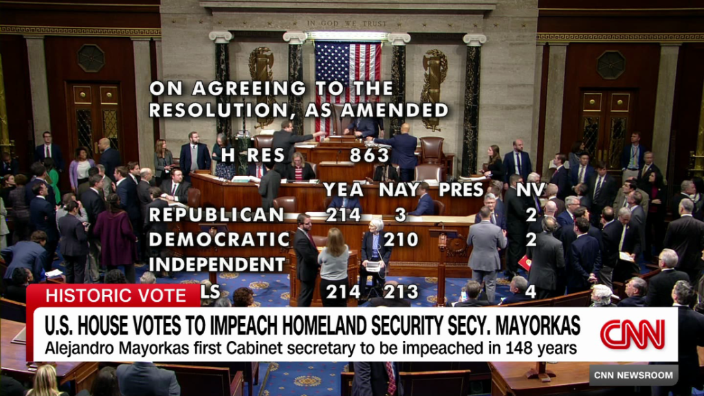 CNN’s Melanie Zanona reports from Washington, where U.S. House Republicans voted Tuesday to impeach Homeland Security Secretary Alejandro Mayorkas, the first Cabinet secretary to be impeached in almost 150 years.CNN’s Melanie Zanona reports from Washington, where U.S. House Republicans voted Tuesday to impeach Homeland Security Secretary Alejandro Mayorkas, the first Cabinet secretary to be impeached in almost 150 years.
