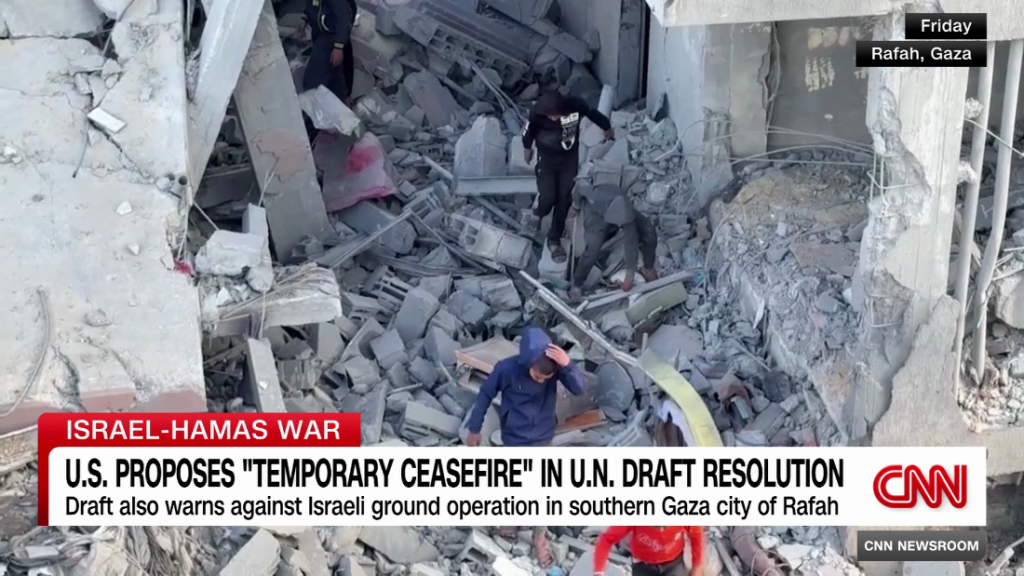 The U.S. has proposed a U.N. Security Council draft resolution on Gaza calling for a temporary ceasefire in Israel’s war against Hamas. CNN’s Max Foster and journalist Elliott Gotkine discuss the proposal.The U.S. has proposed a U.N. Security Council draft resolution on Gaza calling for a temporary ceasefire in Israel’s war against Hamas. CNN’s Max Foster and journalist Elliott Gotkine discuss the proposal.