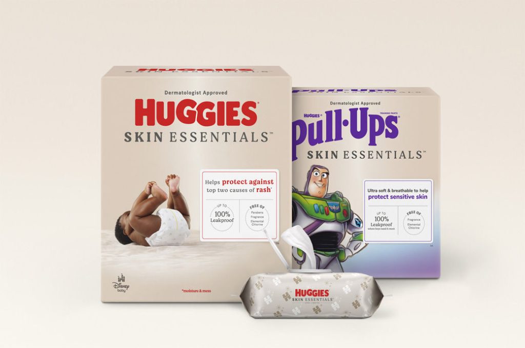 Huggies introduces Skin Essentials diapers, wipes, training pants, focusing on baby’s skin health.