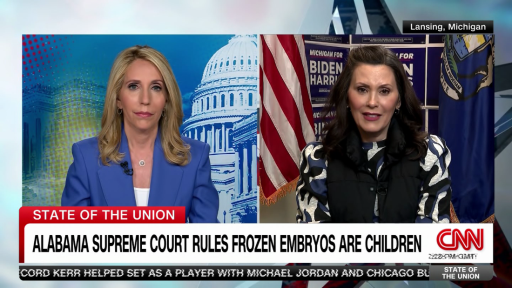 On CNN’s State of the Union with Dana Bash, Michigan Gov. Gretchen Whitmer blasts Republicans over the controversial Alabama Supreme Court ruling that frozen embryos are children.On CNN’s State of the Union with Dana Bash, Michigan Gov. Gretchen Whitmer blasts Republicans over the controversial Alabama Supreme Court ruling that frozen embryos are children.